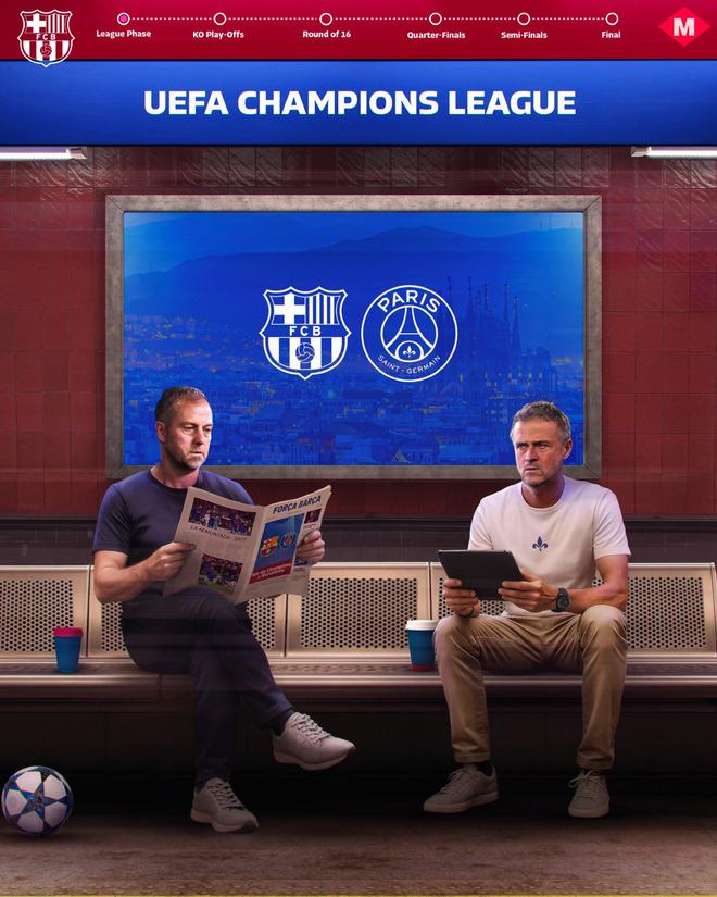 北京时间10月2日,欧冠联赛阶段第2轮,巴萨将在主场迎战巴黎圣日耳曼。赛前,巴萨俱乐部官方社交媒体发布了本场比赛的预热海报。海报中,两队主帅弗里克和恩里克出镜。北京时间10月2日3:00,欧冠联赛再战一轮,巴萨将坐镇主场迎战卫冕冠军巴黎圣日耳曼。早些时候,巴萨俱乐部官方社交媒体发布了本场比赛的预热海报。海报中,两位主帅坐在长椅上,等待着列车的到来。恩里克手中拿着PAD,而弗里克则在一旁看着报纸,报纸上的新闻是2016/17赛季欧冠1/8决赛次回合,巴萨主场6-1逆转巴黎的诺坎普奇迹。有意思的是,当时的巴萨主帅恰恰是坐在弗里克旁边的巴黎现任主帅恩里克。
