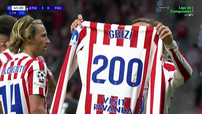 雷速体育10月1日讯 欧冠联赛阶段第2轮,马竞主场迎战法兰克福。上半场补时阶段,格列兹曼破门,打入个人马竞生涯第200球。在进球后,格列兹曼也拿出提前准备好的马竞生涯200球纪念球衣进行庆祝。在2014年首次加盟马竞以来,格列兹曼已代表马竞出场454次,打入200球并送出93次助攻。