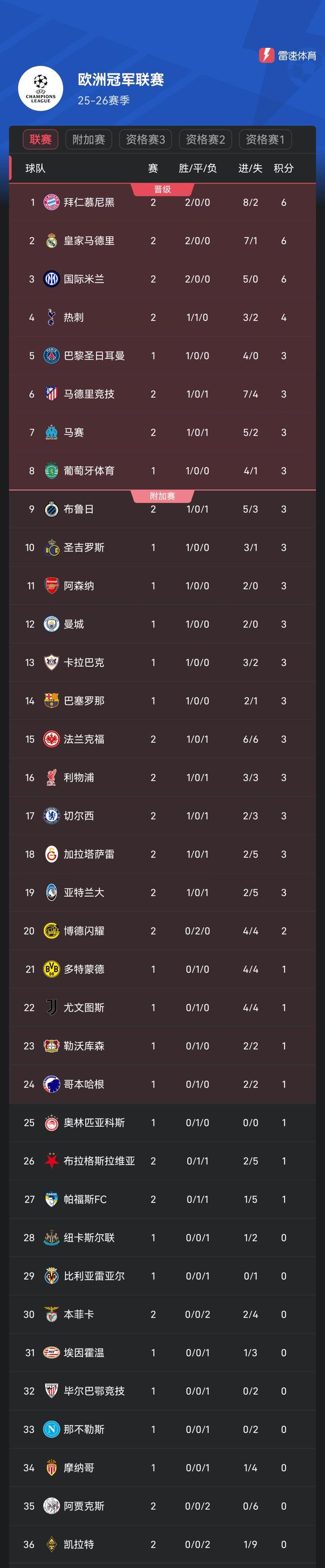 欧冠第2轮首日后积分榜:拜仁领跑,利物浦输球后降至第16