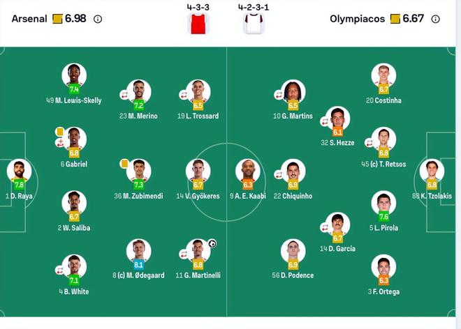 北京时间10月2日凌晨,欧冠联赛继续进行,阿森纳坐镇主场,迎战来自希腊的奥林匹亚科斯。和上周末战胜纽卡的首发阵容相比,阿尔特塔进行了6处调整。第14分钟,约克雷斯中柱,马丁内利补射破门。之后,拉亚做出世界级的扑救,力保球门不失。下半场加布里埃尔伤退,萨卡补时破门。最终,阿森纳2-0战胜奥林匹亚科斯,欧冠不仅取得2连胜,且一球未失。【比赛焦点】第14分钟,厄德高送出精准直塞,约克雷斯在两人夹击的情况下,硬生生挤出空间起脚射门,皮球击中立柱弹出,马丁内利补射破门。第20分钟,面对波登斯直奔死角的头球,拉亚做出世界级的扑救,力保球门不失。第66分钟,拉亚再次送出神扑,挡出了塔雷米的头球,齐奎尼奥跟进补射破门,边裁立即举旗,越位在先进球无效。第82分钟,萨卡倒三角传中找到空位的厄德高,阿森纳队长左右开弓,两次都是必进的机会,都被防守球员挡出。第92分钟,接到厄德高的助攻,萨卡打穿门将小门,锁定胜局。【精彩瞬间】第2分钟,斯凯利送出精准传中,马丁内利无人盯防的情况下甩头攻门,皮球几乎擦着立柱出了底线。第17分钟,接到本怀特的传球,厄德高禁区内起脚射门,皮球被挡了一下速度减慢,约克雷斯没能完成射门。第30分钟,又是来自厄德高的妙传,约克雷斯没有选择传给位置更好的马丁内利,而是决定小角度射门,皮球被后卫封堵。第40分钟,约克雷斯一个急刹车闪出角度,起脚爆射,皮球高出横梁。第53分钟,阿森纳连续传递,特罗萨德有足够的调整空间,结果射门相当离谱。第74分钟,拉亚出击抱住皮球后,泰山压顶,将加布里埃尔折叠在自己的身上,加布里埃尔随后被莫斯克拉换下。【球员评分】【出场阵容】阿森纳首发:1-拉亚、2-萨利巴、4-本-怀特(58’12-廷伯)、6-加布里埃尔(74’3-莫斯克拉)、49-斯凯利、8-厄德高、36-苏维门迪、23-梅里诺(58’41-赖斯)、11-马丁内利(74’10-埃泽)、19-特罗萨德(74’7-萨卡)、14-约克雷斯。阿森纳替补:13-凯帕、35-塞特福德、16-诺尔高、22-恩瓦内里、33-卡拉菲奥里、56-道曼。奥林匹亚科斯首发:88-佐拉基斯、20-科斯蒂尼亚、3-奥尔特加、5-皮罗拉、45-雷索斯(86’27-斯特雷费扎)、32-赫泽(86’96-穆扎基蒂斯)、14-丹尼尔-加西亚(74’16-西皮奥尼)、10-马丁斯(62’99-塔雷米)、22-奇奎尼奥(86’4-比安科内)、22-波登斯、9-卡埃比。奥林匹亚科斯替补:1-柏斯查拉吉斯、61-库拉克利斯、6-卡罗格罗普洛斯、8-纳西门托、70-布鲁诺、80-普尼莫尼德斯。