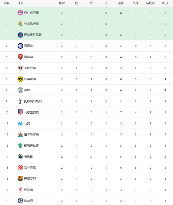 随着巴黎21绝杀巴萨,曼城22遭绝平,欧冠最新积分榜:拜仁领跑