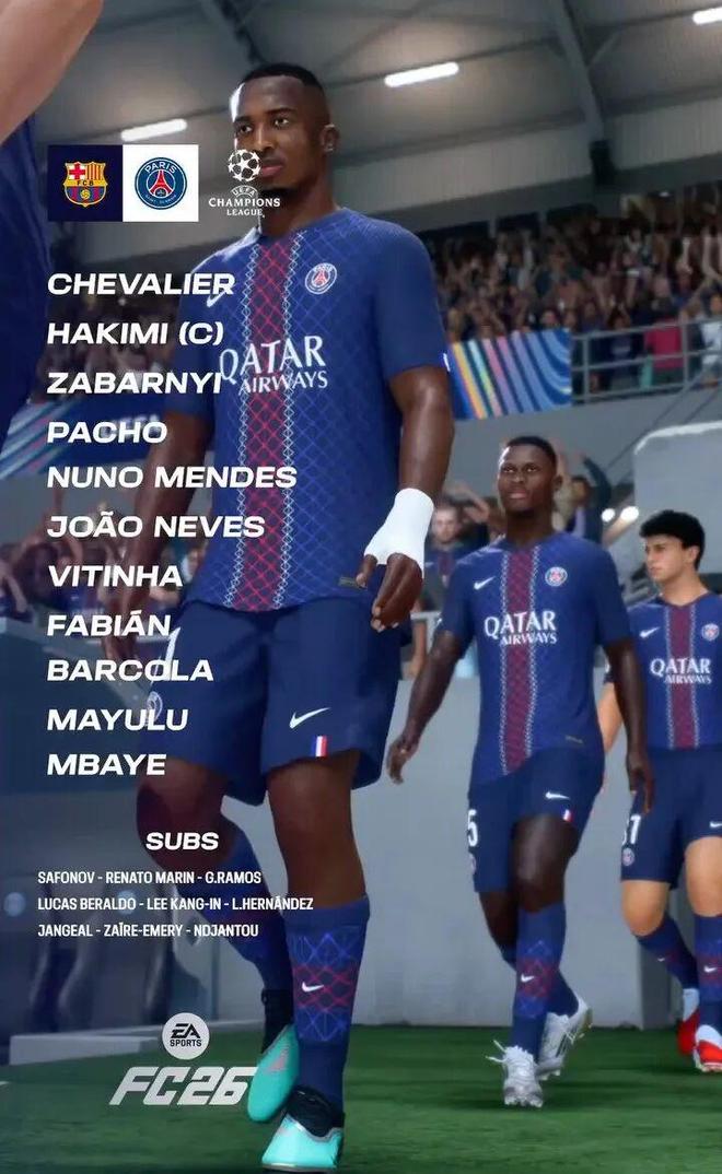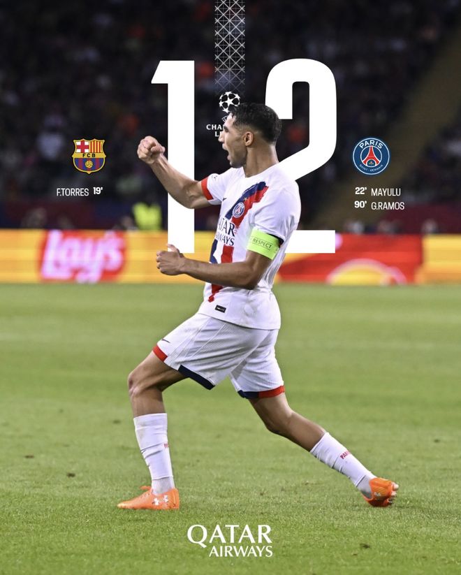首发名单 北京时间10月2日凌晨3:00,欧冠联赛阶段第2轮,大巴黎客场对阵巴塞罗那。争取小组赛两连胜,继续欧冠征程! 上半场 第19分钟,由巴塞罗那费兰·托雷斯率先取得进球。 第38分钟,大巴黎扳平比分!努诺·门德斯连过数人送出精彩助攻,马尤卢推射破门比分来到1:1! 半场结束,球队暂时1:1巴塞罗那。 下半场 第80分钟,巴萨配合失误,替补上场的李刚仁突破打门击中立柱,巴萨逃过一劫! 第90分钟,绝杀!贡萨洛·拉莫斯接到阿什拉夫助攻,门前冷静推射!比分最终定格在巴黎2:1巴萨! 最终,巴黎在客场1:2战胜巴塞罗那,取得欧冠两连胜!!