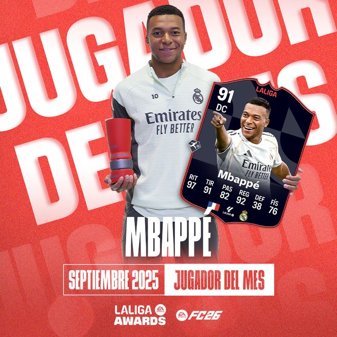 • 4场5球1助,官方:皇马前锋姆巴佩当选西甲9月最佳球员