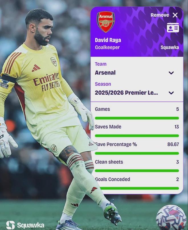 英超扑救成功率最高的门将,86.67%。此外自从23-24赛季拉亚加盟阿森纳之后,他已经在