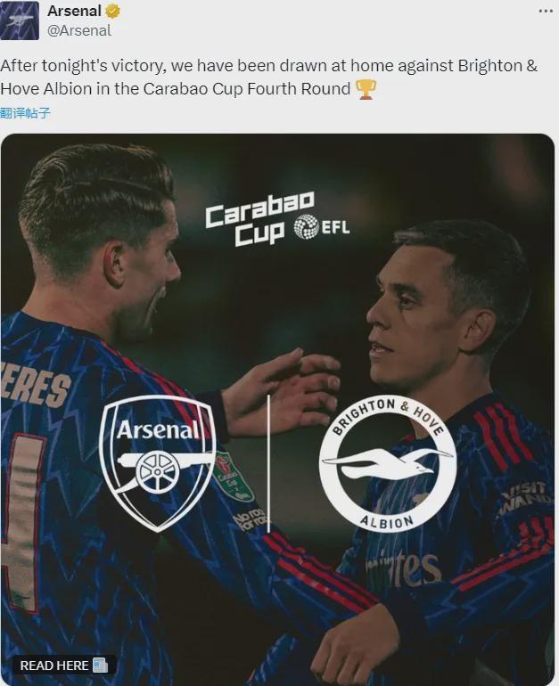 马官方:在击败韦尔港之后,阿森纳将在卡拉宝杯第四轮中主场对阵布莱顿。本场比赛暂定于10月27日开始的一周里进行。阿森纳上次在卡拉宝杯中遭遇布莱顿是在2022-23赛季,当时布莱顿3-1取胜,将阿森纳淘汰出局,双方上赛季两场