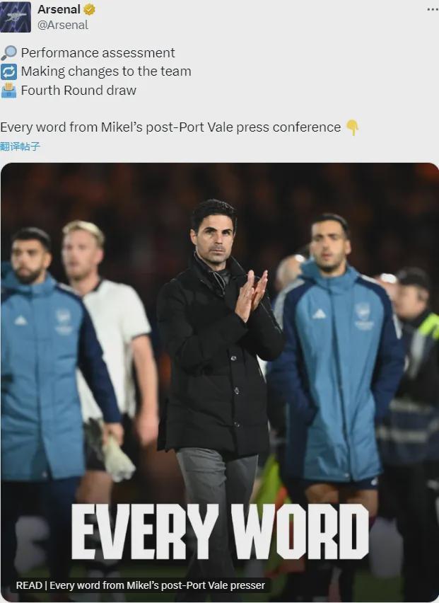 阿尔特塔出席了赛后新闻发布会,我们来看主要内容。如何点评这场比赛?我认为球队比赛开场之后表现很好,非常有统治力,并且打进了1球,我们还有3-4次机会进球,但没有把握住。下半场我们对比赛稍稍失去了控制,缺少一些掌控和统治力,但在经过一番调整后,我们重回正轨。球队打进了精彩的第二球,萨利巴的传球和特罗萨德的终结是顶级的。总体来说,我对胜利、零封和凯帕的首秀感到满意,还有埃泽的进球,这是他的处子球。而且我们对首发阵容做出了9处调整,却依然能表现非常好,这点也很满意。你本来的计划就是让萨卡踢一个小时吗?他好像有点受伤?这都是计划好的,60分钟是最大值。我们必须以不同的原因换下萨卡,尤其是控制他的负荷,所以这都是计划好的。好消息是没人受伤,萨卡没有肌肉方面问题,所以这是好消息。你对首发阵容做了9处调整,却依然还能派出这样强大的球队,这是否说明阿森纳阵容水平十分强悍?是的,除此之外,我们需要做的就是把这些没有经常在一起踢比赛的球员捏合在一起,拿出我们想要的表现。今天的中场是完全不同的,锋线也一样,道曼还得到了替补的机会,并且立即融入了比赛,所以这场胜利有很多积极因素。这些球员有没有着眼周末的比赛?比如斯凯利和恩瓦内里找你表达想要出战的想法?这正是我们想要看到的,球员们给我们和我带来选择的难题,因为这意味着他们和球队的连接非常好,非常想帮助球队,而每个人都会获得很多出场时间。简单说说吧。萨卡没受伤就是最好的消息,然后只要球队取胜了,管他是1-0还是2-0,无所谓了,这个赛季可以要结果不要过程。阿尔特塔说球队表现很好,我也没看比赛,很好就很好,咱也不给他犟,英格兰低级别联赛球队的主场也不是那么好踢,再说这场确实轮换不少。实际上只看首发阵容很容易感觉似乎还是派上了很多主力,那是因为现在阿森纳的阵容确实太强了,调整了9个主力,看起来上场的还都是球星,这就是现在的阿森纳,不是没轮换,是轮换球员和首发的差距真的不大,除了个别位置。不过萨利巴又踢全场值得商榷……这是联赛杯第三轮,这场比赛没有新的青训小将登场的话,接下来就不用想了,正如我之前所说,以目前的阵容深度,球星都要竞争轮换,没有空间再给青训新人了,你这场用年轻人,不说恩瓦内里、斯凯利,怀特、诺尔高、马丁他们什么时候首发?没办法……这个赛季就是以胜利为主基调,其他都要让路。