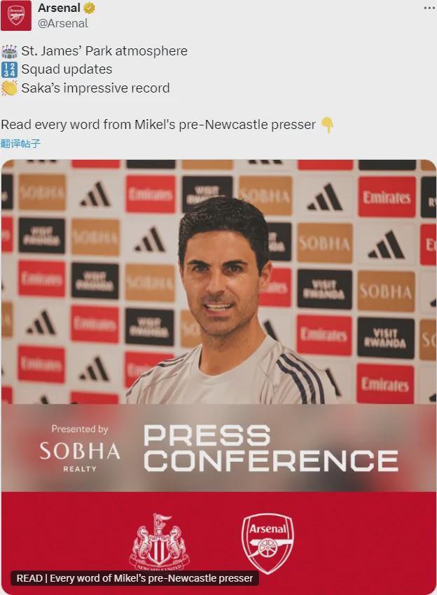 英超最好的阵容,而每个阶段所有球员的贡献都是关键。从锋线开始,他们对防线和对方门将的施压非常给力,所以这是团队工作,这是一项团队运动,我们所做的任何事,所有球员都扮演了重要的角色。当年你作为球员加盟阿森纳时,纳斯里、法布雷加斯和范佩西都决定不续约,而今作为主教练,你手下的球员们都决定续约留队,你怎么看阿森纳过去12年里的发展?我认为环境背景是不同的,因为当年我们搬到酋长球场时,俱乐部也有自己的需要,所以我认为很难比较。我能说的就是,我很开心看到球员们如此忠于这支球队,如此愿意继续保持下去,因为我们也想留住他们。你有什么关于萨卡续约的好消息告诉我们吗?我希望有。据我所知,萨卡非常开心,也非常自豪能在这支俱乐部扮演他现在的角色。事情会水到渠成,所有人都知道萨卡对我们的重要性,所以希望我们能做到(续约)。对曼城的比赛中埃泽出现在了中场位置并送上了关键助攻,你以后会经常要求他这么做吗?还是说这是埃泽当时的灵光一现?是的,特别是他回撤到中场,并且能传出像助攻小马丁那样的传球时,我会告诉他这种传球越多越好。以上是新闻发布会的部分内容,还有很多关于纽卡斯尔的话题就不说了,战胜他们比说什么都强!伤病的话,看来还是好消息多,厄德高和萨卡都没问题,我觉得厄德高能进大名单,萨卡应该可以首发。马杜埃凯的话,扫不扫估计都这样了,2个月左右,不会出入很大的。关于萨利巴的续约,实际上就等官宣了,下个国际比赛日前估计就能官宣,没什么问题了。萨利巴确实成长很大,让人忘记了他的年龄,其实他也才24岁,还非常年轻,但已经稳定的保持在顶级水平多年了,这一续约的话,基本上就锁定了一个名宿的位置,假设阿森纳能夺得重要冠军,那就是妥妥的传奇,他和加布都是。防守现在已经几乎到极致了,新赛季只丢2球,一个是世界波任意球,一个是反击,而且对手是利物浦和曼城,其实已经做得非常好了,剩下的是老生常谈,把进攻理顺了,冠军就是水到渠成的!看起来阿尔特塔对萨卡续约也很乐观,其实这是肯定的,无非时间问题,完全不用担心萨卡的续约问题。至于当年忠义三君子叛逃和今天球星争相续约的对比,我觉得没什么意义,但凡看了15年以上阿森纳的球迷都清楚,当年那是什么环境。现在是工资给到位,年年砸球星,当年是工资抠抠搜搜,年年卖球星,一进一出差多少?
