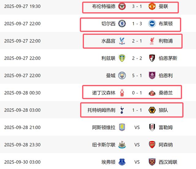 北京时间9月28日,英超第6轮继续进行,热刺和诺丁汉森林都爆出冷门,其中热刺主场1-1绝平狼队,连续2轮不胜,而诺丁汉森林更是在主场0-1输给桑德兰,换帅后他们还没有取胜。本轮比赛,热刺主场迎战狼队,后者新赛季5场全败,是表现最差的球队,没有之一。没想到的是,本场热刺翻车了。下半场,布埃诺早早进球,帮助狼队取得领先。之后热刺狂攻,不过他们一直得势不得分。比赛进入补时,狼队距离联赛首胜越来越近。关键时刻,帕利尼亚站了出来,他接到萨尔的做球,最终在禁区外推射破门,这个精彩进球,也帮助热刺1-1绝平对手,而狼队最终也无缘英超首胜。不过尽管战平狼队拿到1分,但是热刺已经连续2轮不胜,球队状态下滑,下周中热刺还要在欧冠客场出战博德闪耀,如果主帅不能尽快调整状态,热刺随时会在英超和欧战连番受挫。除了热刺之外,诺丁汉森林也爆出冷门。本轮比赛,诺丁汉森林主场迎战升班马桑德兰,结果凭借阿尔德雷特的头球破门,桑德兰在客场1-0击败了诺丁汉森林。赛季至今,诺丁汉森林前6轮比赛,仅仅拿到1场胜利。因为和球队高层闹翻,功勋主帅努诺下课,诺丁汉森林选择了前热刺主帅科鲁格。加上联赛杯和欧联杯,科鲁格率队踢了5场比赛,结果2平3负无一获胜。不得不说,诺丁汉森林已经彻底崩了,如果再无法扭转颓势,这支上赛季的英超大黑马,很可能要保级了。事实上,这一夜英超还有多支强队爆冷。其中曼联在客场惨败给布伦特福德,阿莫林上任至今,他还从来没有率领球队在英超取得连胜。此外切尔西在主场输给了布莱顿,同样让人意外。更绝的是,本赛季一直绝杀对手的利物浦,在客场被水晶宫绝杀,斯洛特终于尝到了被绝杀的痛苦了。接下来,纽卡斯尔将在主场迎战阿森纳,埃弗顿和维拉则分别对阵西汉姆和富勒姆,不知道还会不会有冷门发生!