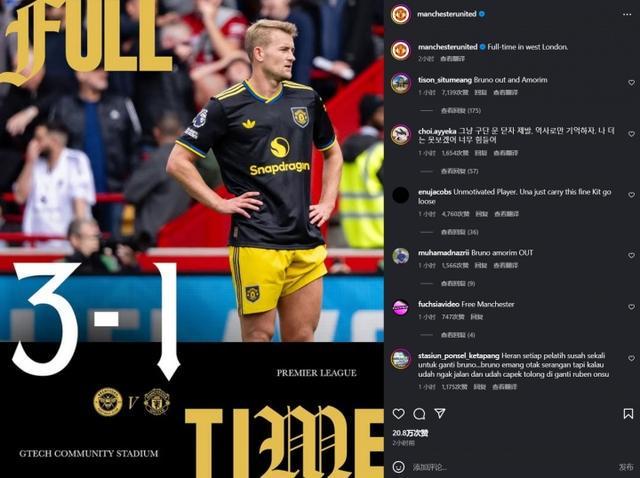 9月28日讯 曼联本轮1-3不敌布伦特福德,在上轮击败十人蓝军后,球队没能延续势头。这场失利令球迷失望透顶,这也在曼联官方社媒评论上有直观体现。tison_situmeang:B费和阿莫林一起滚choi.ayyeka:解散吧,我们记住历史就好了,看不下去了,太难了enujacobs:毫无动力的球员们,穿上这件球衣就不会踢了muhamadnazrii:布鲁诺·阿莫林滚蛋fuchsiavideo:解放曼市vladimir_soloviov:很遗憾,我们就踢不了11个人的队amorim.outtt:阿莫林滚蛋elsen.12:范尼回来吧dantob04:解雇阿莫林!他太烂了!devsfootballclub:我已经无所谓了,这才是最痛的独家看英超就在咪咕