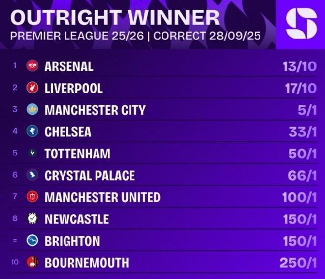 英超冠军赔率显示,阿森纳以 13/10 的赔率升至榜首,力压 17/10 的利物浦与 5/1 的,成为本赛季争冠的最大热门之一。曼城