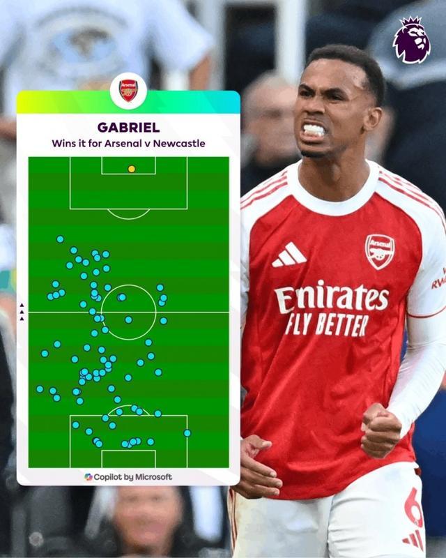 9月29日讯 英超第6轮比赛,加布里埃尔补时阶段头球绝杀,帮助阿森纳客场2-1击败纽卡。英超官方更新社媒动态,晒出加布里埃尔本场比赛的触球分布,他的覆盖范围很大,而仅在对方禁区触球一次就攻入绝杀进球。独家看英超就在咪咕
