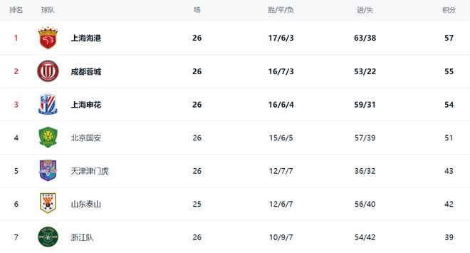 中超第26轮进行了2场比赛。天津津门虎在主场迎战河南队。这场比赛双方都踢得比较谨慎,同时比赛非常激烈,总共出现了7张黄牌。王秋明在第57分钟抓住机会,补射破门。这是全场唯一的进球,帮助天津津门虎1-0击败河南队。天津津门虎机会很少,只有3次射门,结果把握住了机会。而河南队虽然有10次射门,但射门质量奇差,只有1次射正,没能进球。虽然是主场作战,但于根伟还是选择保守的战术,最终的结果还是比较理想的。天津津门虎赢下这场比赛,意味着取得3连胜,3场比赛都零封对手,包括4-0横扫武汉三镇,1-0险胜深圳新鹏城,1-0击败河南队。这也是天津津门虎本赛季首次在联赛取得3连胜。深圳新鹏城则在主场倒下了,惨遭青岛西海岸逆转。韦斯利在开场第5分钟就帮助深圳新鹏城取得领先。但深圳新鹏城的防守实在是太差劲,总会以各种方式丢球。这场比赛也没有意外。戴维森就依靠张卫失误获得的机会,把比分扳平。下半场深圳新鹏城的另一名后卫杨一鸣犯下致命错误。他禁区内手球送点。阿齐兹点球罚进,帮助青岛西海岸完成逆转。最终深圳新鹏城1-2输给了青岛西海岸。深圳新鹏城连续9场比赛输掉了8场!在积分榜上,上海海港的战绩是17胜6平3负,拿到57分排名榜首。第2的是成都蓉城,16胜7平3负,拿到55分。前2的差距只有2分。而联赛只剩下4轮,剩下每场比赛的胜负都将直接影响到最终的冠军归属。显然,现在上海海港已经获得夺冠主动权。上海申花以54分排名第3。北京国安只拿到51分,排名第4。第5的是天津津门虎,拿到43分。山东泰山只拿到42分排名第6。