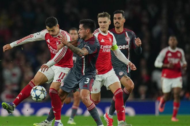 欧冠联赛阶段第2轮的一场比赛展开争夺,阿森纳在主场迎战奥林匹亚科斯。阿森纳联赛战绩出色,6场联赛取得4胜1平1负的成绩,拿到13分,仅比榜首的利物浦少2分,排名第2。最近两场联赛阿森纳都在最后时刻爆发进球从而避免输球,非常坚韧。这一次阿森纳来到欧冠赛场,结果,阿森纳轻松拿下比赛。阿森纳各项赛事9场7胜,三线冲击冠军!阿森纳排出433阵型。马丁内利、哲凯赖什和特罗萨德的进攻三叉戟联袂出击。厄德高、苏比门迪和梅里诺组成3中场。本-怀特、萨利巴、加布里埃尔和斯凯利4后卫首发出战。戴维-拉亚担任首发门将。阿森纳的首发阵容总身价6.17亿欧元,而奥林匹亚科斯的首发阵容总身价6640万欧元。比赛刚开始不久,阿森纳就获得了机会。马丁内利在禁区内包抄头球攻门,结果顶偏了。第12分钟,阿森纳进球了!哲凯赖什突入禁区,起脚射门。门将把球扑了一下,皮球缓缓向球门滚动,结果击中立柱弹出,马丁内利跟上补射,把球打进。第21分钟,波登斯在禁区内凌空射门,拉亚做出精彩扑救化解险情。第31分钟,哲凯赖什突入禁区左侧,起脚射门,踢飞了。随后,特罗萨德的射门被挡了出去。第42分钟,哲凯赖什再次获得机会,这一次他的射门还是踢高了。半场结束,阿森纳1-0领先奥林匹亚科斯。下半场易边再战。第53分钟,特罗萨德在禁区左侧兜射远角,偏了一点,皮球直接出了底线。第66分钟,奇基尼奥门前补射打进,但此前队友越位了,进球无效。阿森纳逃过一劫。第82分钟,厄德高的射门被挡了出去。补时阶段,阿森纳再次进球!萨卡在禁区左侧低射破门,杀死比赛。最终,阿森纳2-0完胜奥林匹亚科斯。阿尔特塔率队狂飙,各项赛事取得3连胜。